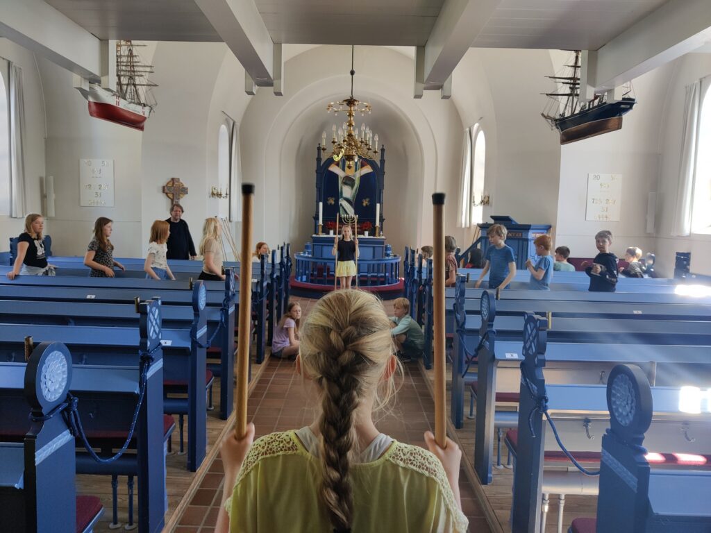 Igen i dag sluttede vi i kirken. Vi fik prøvet overgangene, som blev øvet tidligere, og hvor i rummet instrumenterne kan stå.