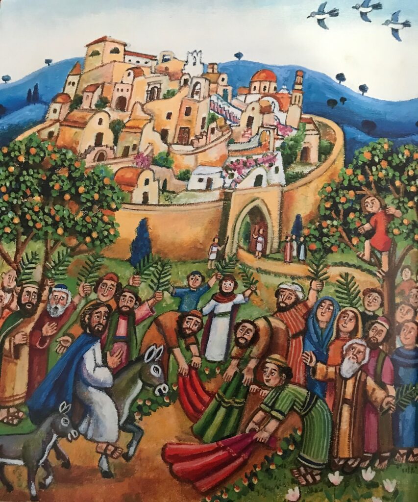 | Opgaver | Hæng billederne op i klassen. Lad eleverne selv eller i grupper skrive sedler, hvor de til hver billede skriver, hvad der skete på dagene. Lad eleverne efterfølgende kikke og læse hinandens sætninger. Nu skal eleverne selv prøve at illustrere en af dagene. Lad eleverne selv vælge den dag, de synes de kan lave en illustration af. Hvordan ser enten Palmesøndag, Skærtorsdag, Langfredag og Påskesøndag ud i dag ud fra din tanke og forestilling? – Hæng billederne op, måske ved siden af de billeder som I allerede har skrevet sætninger til. |